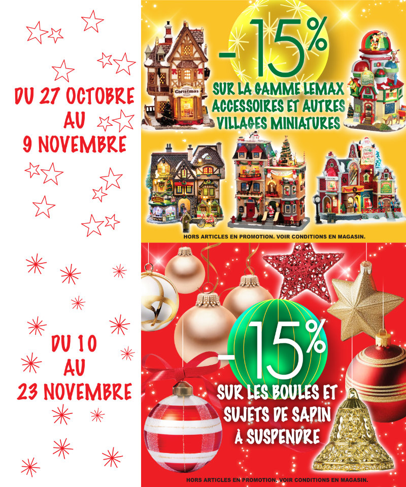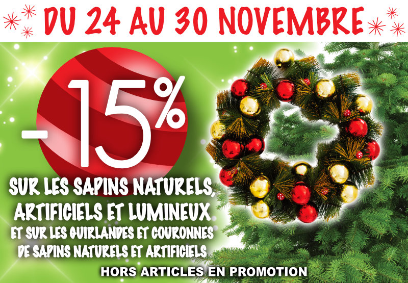 -15% sur les sapins naturels, artificiels et lumineux et sur les guirlandes et couronnes de sapins naturels et artificiels.